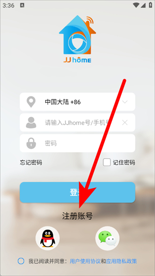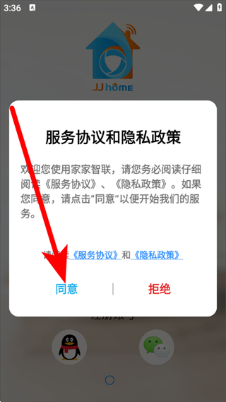 1、打开家家智联,在弹出提示框,点击同意,进入登录界面。