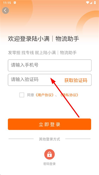 4、在验证码登录页面,输入对应手机号,点击获取验证码输入,勾选协议,点击立即登录完成操作。