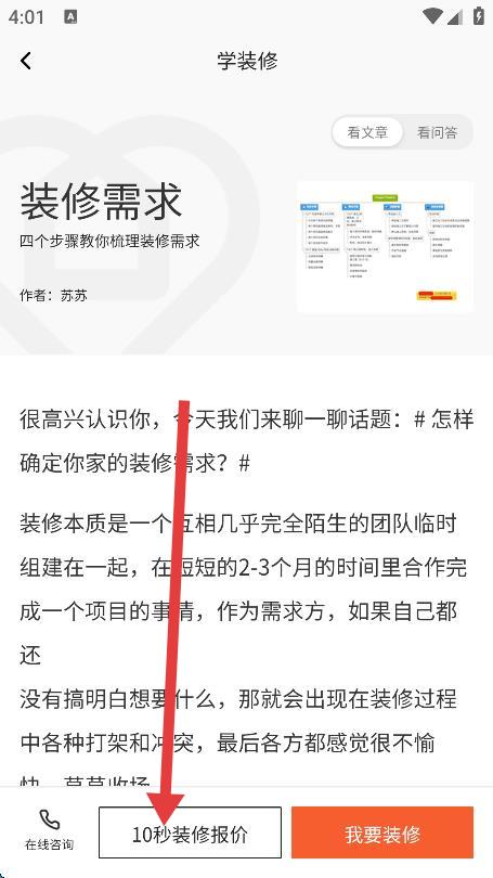 3、进入装修需求页面后,点击下方的10秒装修报价按钮。