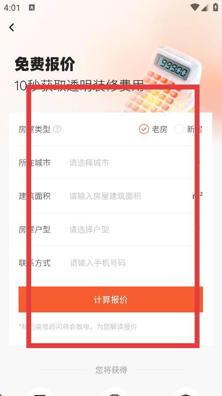 4、按照要求填写信息,完成后点击计算报价按钮,即可获取装修报价。