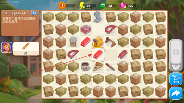 2、将相同的橡皮道具拖动合并,合成更高等级的道具,积累建设进度。