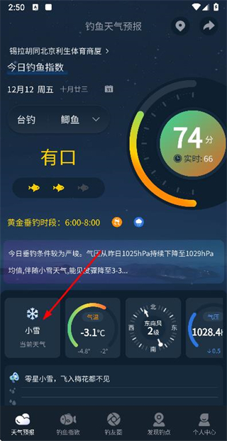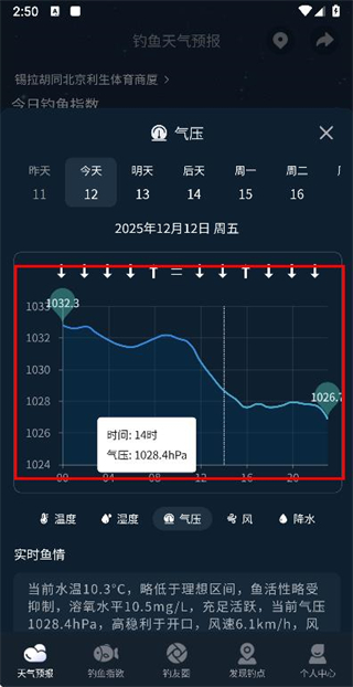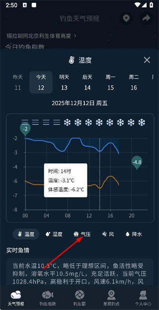 1、在钓鱼天气预报首页点击当前天气区域,进入气象数据页面。