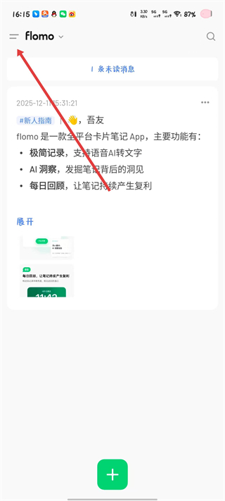 1、打开flomo浮墨笔记应用,点击菜单按钮。