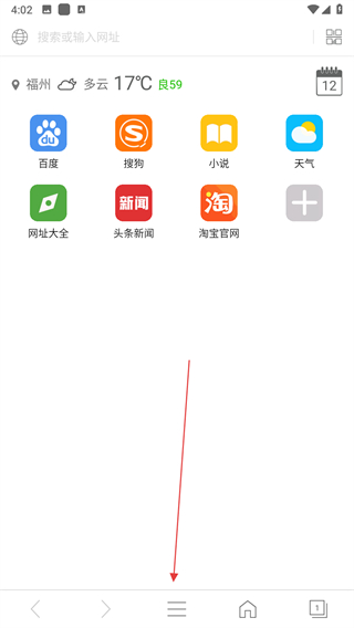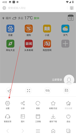 1、打开e浏览器应用,进入主界面后点击底部导航栏的菜单按钮,展开功能选项列表找到设置选项。
