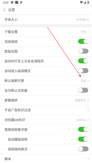 2、在设置页面中,向下滑动查找并点击默认搜索引擎选项,进入搜索引擎选择界面查看可选引擎。
