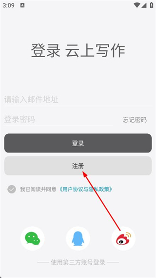 1、打开云上写作APP进入主界面,找到并点击新建相关的选项可能是+号等标识。