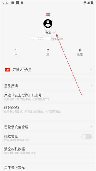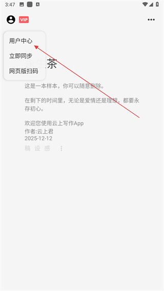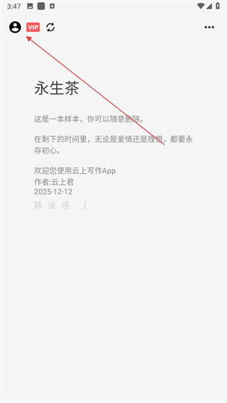 1、打开云上写作应用,点击界面左上角带VIP标识的头像图标,展开功能选项列表。