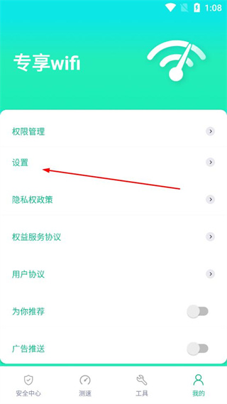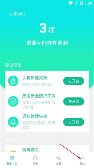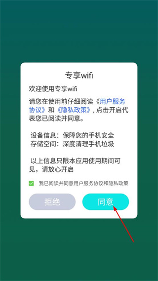 1、打开专享wifi软件,勾选协议后点击同意按钮,进入软件的安全中心界面。