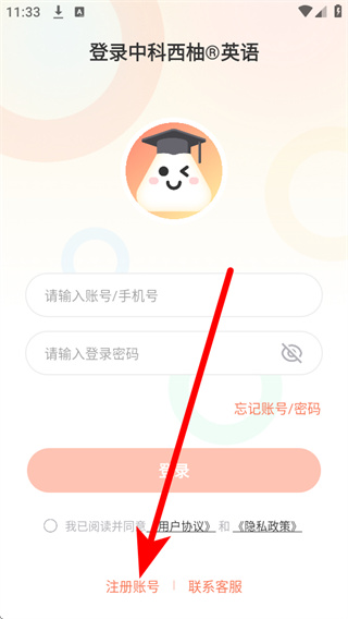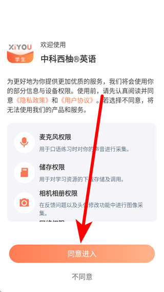 1、打开西柚英语,在弹窗中点击同意进入,进入登录页面。