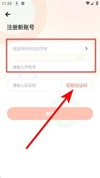3、在注册新账号页面中,先选择所在的学校,再在手机号输入框中填写目标手机号。