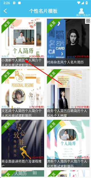 2、在个性名片模板页面点击目标模板,进入该模板的详情页面。