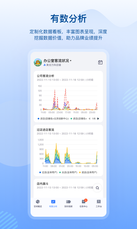 展示门店信息,包括门店客流、货架客流以及设备组数量,门店动态情况随时掌握
