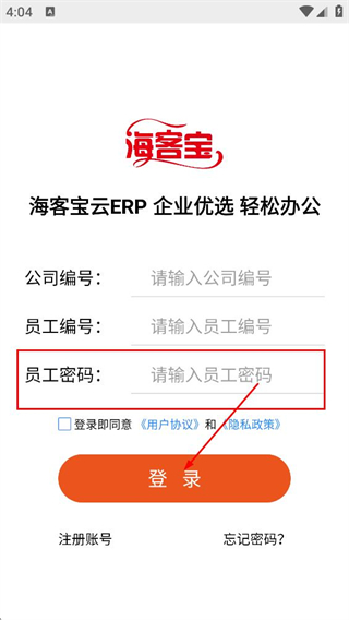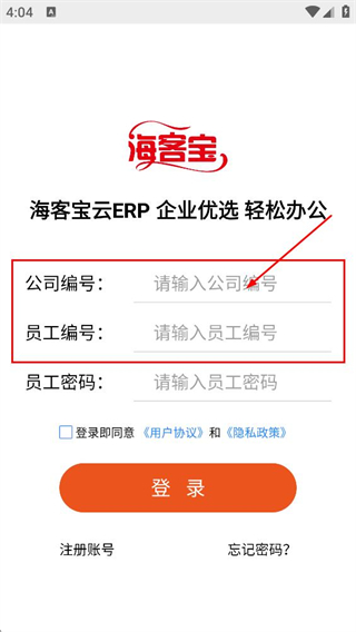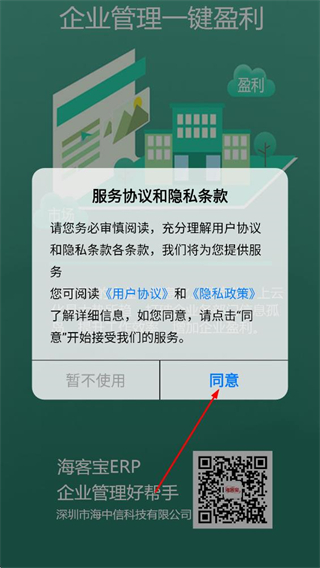 1、在海客宝云ERP的服务协议和隐私条款弹窗中,点击同意,进入登录页面。