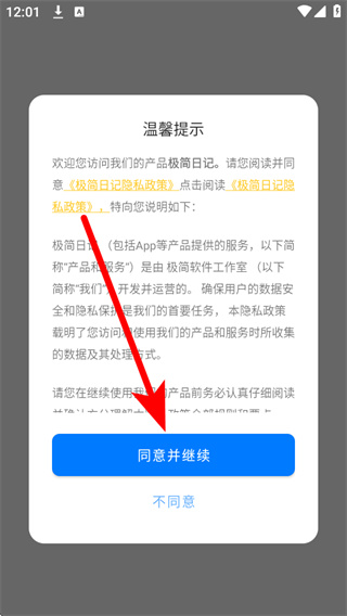 1、打开极简日记,在弹窗中点击同意并继续,进入应用主界面。