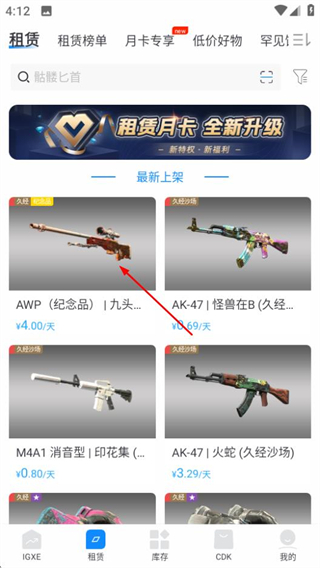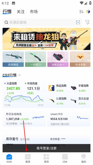 1、在IGXE首页,点击底部的租赁选项,进入租赁页面。