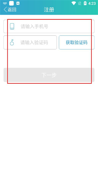 2、在注册页面填写手机号,点击获取验证码并填入收到的短信验证码,点击下一步。