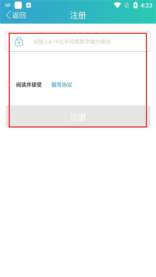 3、在密码设置页面输入密码,勾选阅读并接受服务协议后,点击注册。