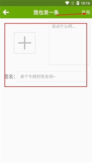 3、在我也发一条页面,可添加图片、输入动态内容、填写签名,点击发布。