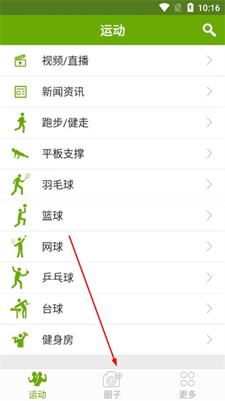 1、打开我爱运动app的运动页面,在底部导航栏点击圈子,进入运动圈页面。