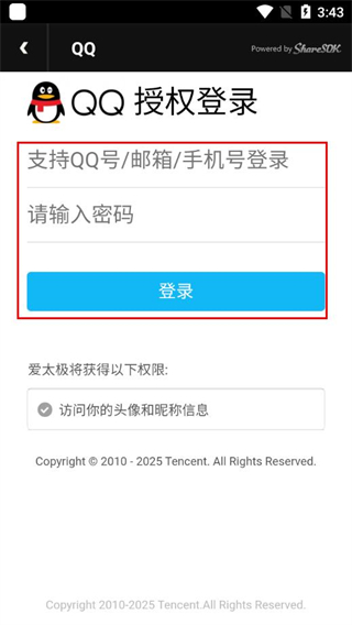 3、填写QQ账号信息并登录,完成授权后即可完成爱太极账号的注册。