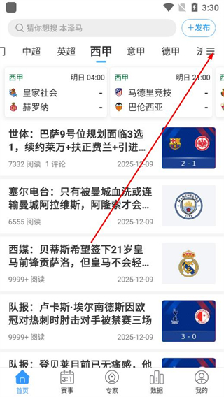 1、打开即嗨比分app的首页,点击顶部频道栏右侧的三横线,进入频道管理界面。