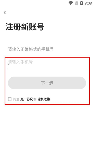 4、在注册页面填写手机号,勾选同意用户协议和隐私政策后点击下一步,获取并填写短信验证码。