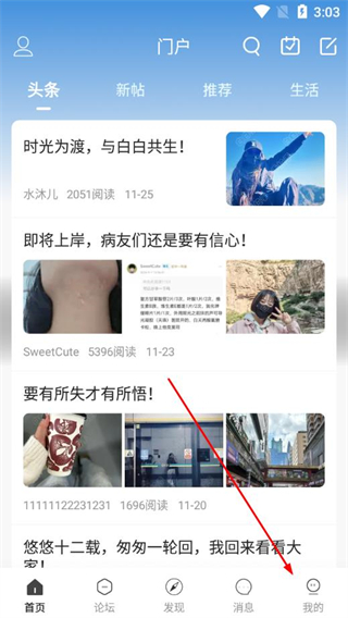 1、打开白白手拉手app的首页,点击底部导航栏的我的选项,进入个人中心页面。