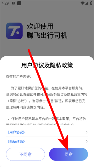 1、打开腾飞出行司机,在弹出提示框,点击同意,进入手机号填写页面。