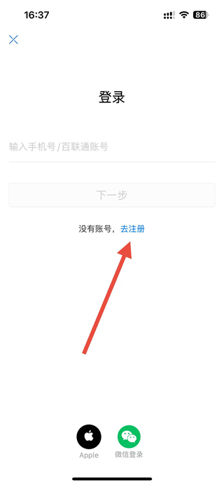 2、在登录页面,选择去注册选项,进入手机号注册界面。