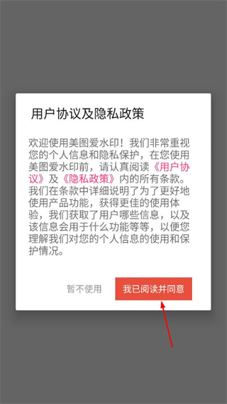 1、打开美图爱水印软件,阅读用户协议及隐私政策后点击我已阅读并同意按钮,进入主界面。