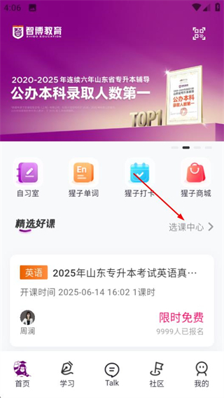 1、在智博教育首页,点击选课中心选项,进入选课中心页面。