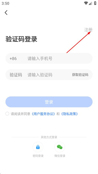 3、在登录页面,点击右上角的注册选项,进入注册页面。