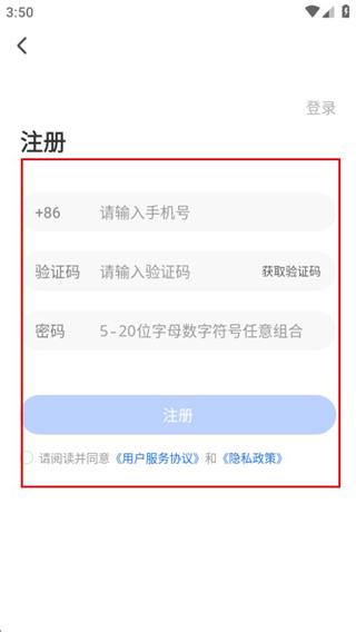 4、在注册页面,填写信息并勾选协议后,点击注册完成账号注册。