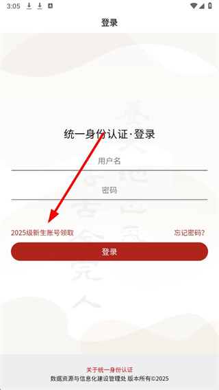 2、在统一身份认证登录界面,选择2025级新生账号领取选项,进入账号领取的信息填写页面。