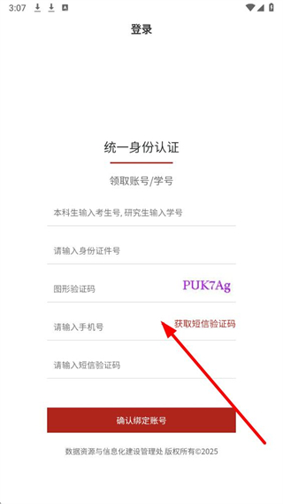 3、在页面依次填写个人信息、手机号,获取短信验证码后,点击确认绑定账号,系统将生成专属新生账号。