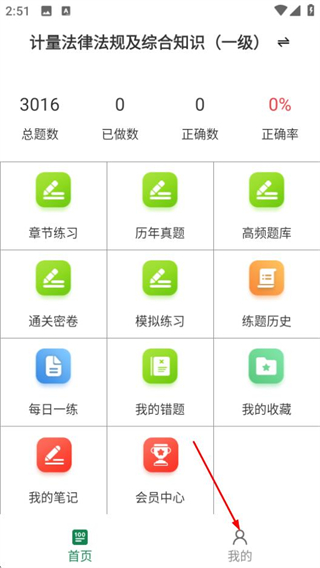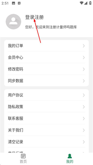 1、在注册计量师鸣题库首页,点击底部的我的选项,进入个人中心页面。