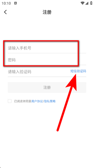 4、在注册页面,输入手机号和密码后,点击获取短信验证码。