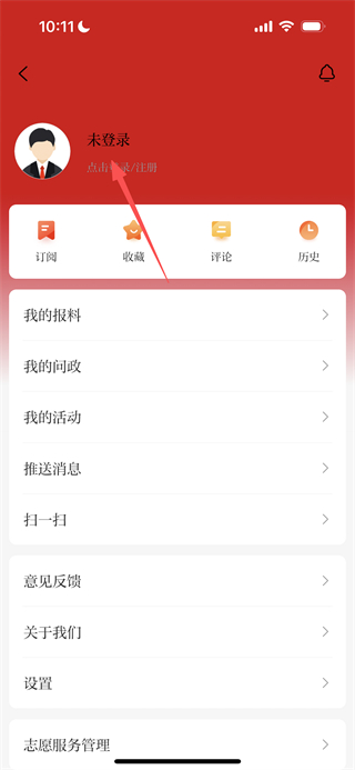 2、在个人中心页面,点击点击登录注册区域,进入登录选择页面。