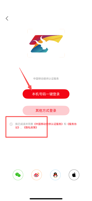 3、在登录页面,勾选协议后点击本机号码一键登录按钮,完成账号登录操作。