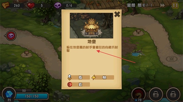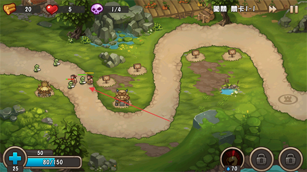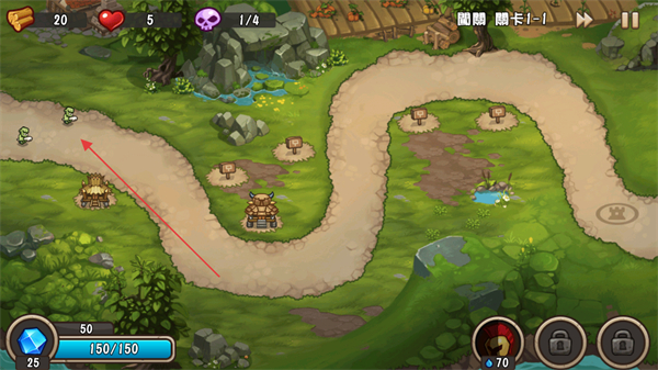 2、根据提示赶紧建造箭塔,消耗资源在路径旁空位建造箭塔,开启防御布局。