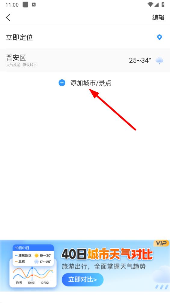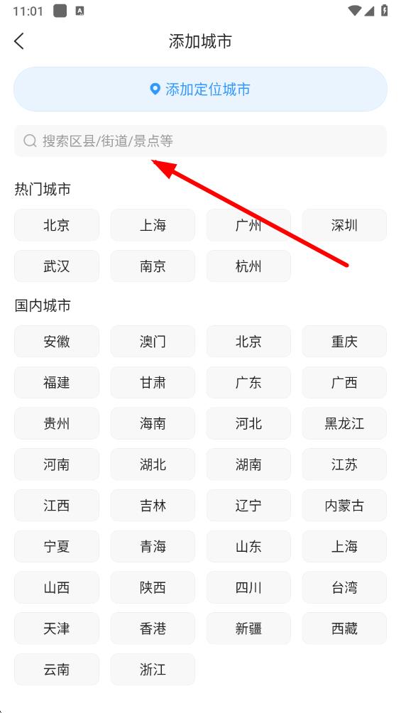 3、在添加城市页面,可通过点击添加定位城市快速添加当前定位城市,也可以在搜索框内输入区县、街道或景点等关键词进行搜索。