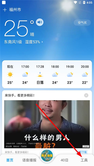 1、在15日天气预报app界面点击工具选项,进入工具页面。