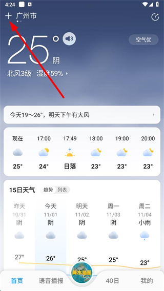 1、打开15日天气预报APP,点击左上角加号进入城市管理页面。