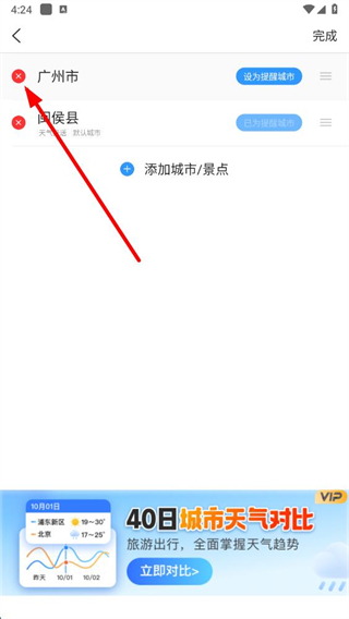 3、在页面找到想要删除城市,点击左侧的删除按钮。