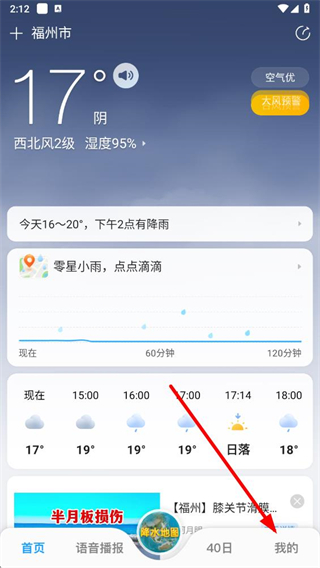1、打开15日天气预报app,点击底部我的选项,进入个人界面。