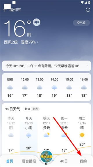 1、打开15日天气预报app,点击右下角我的选项,进入个人页面。