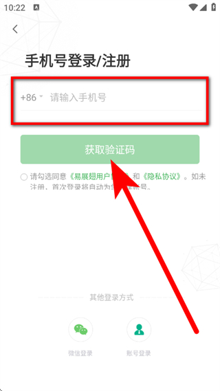 3、在手机号登录注册页面,输入手机号,勾选协议后,点击获取验证码。