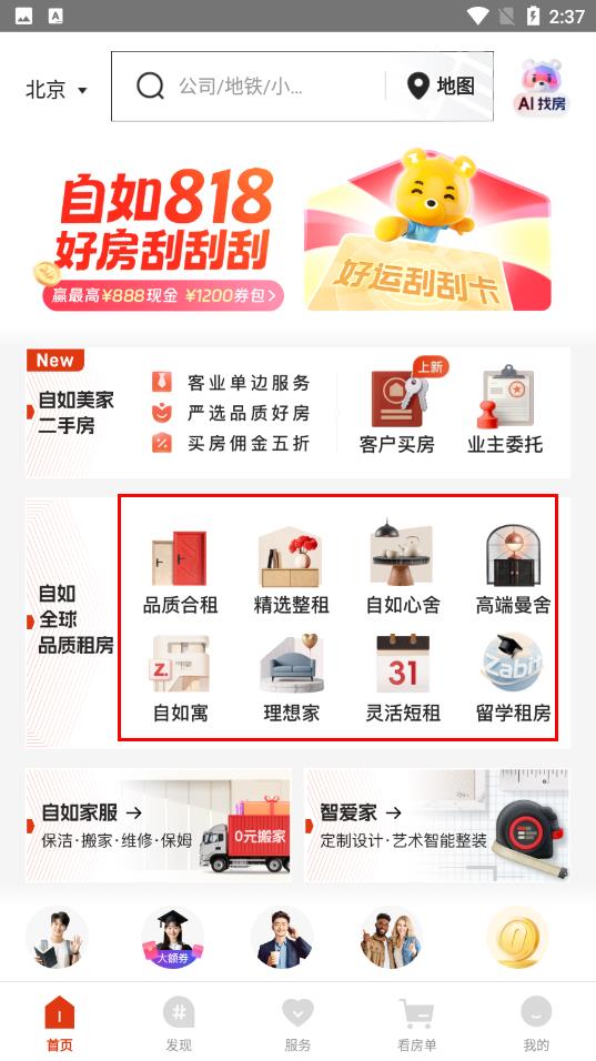 1、打开自如App进入首页,在自如全球品质租房板块,选择租房类型。