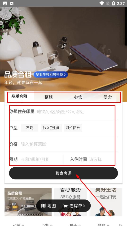 2、根据需求,设置位置、户型、价格、租期、入住时间等筛选条件,点击搜索房源。