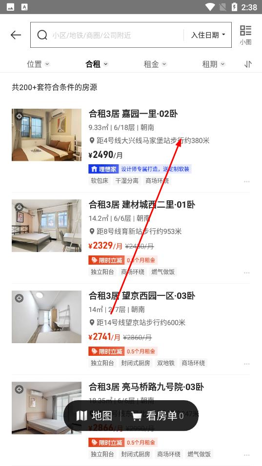 3、搜索结果出来后,浏览符合条件的房源列表,点击感兴趣的房源。